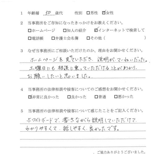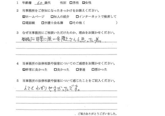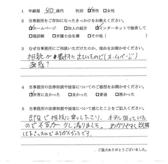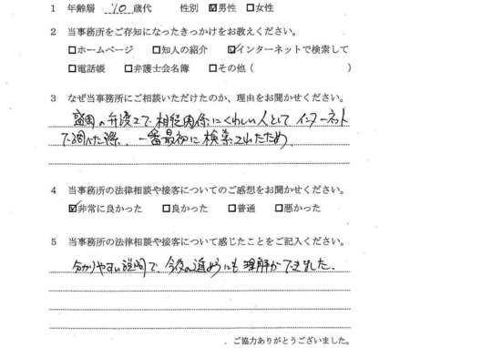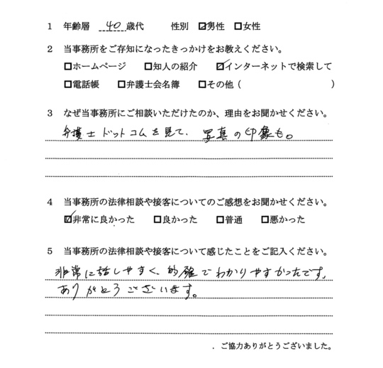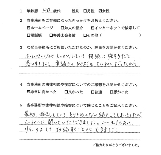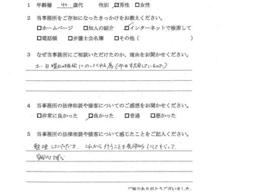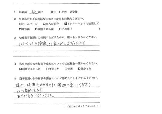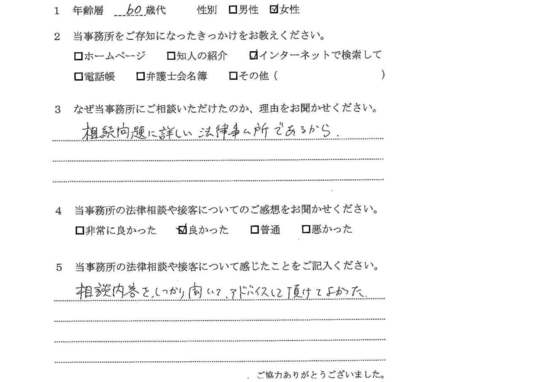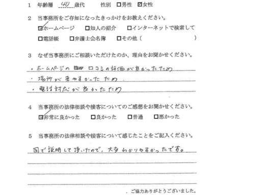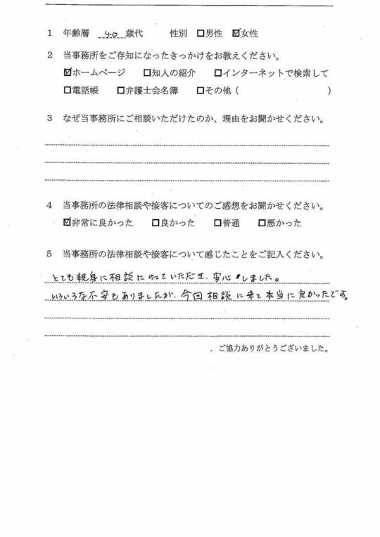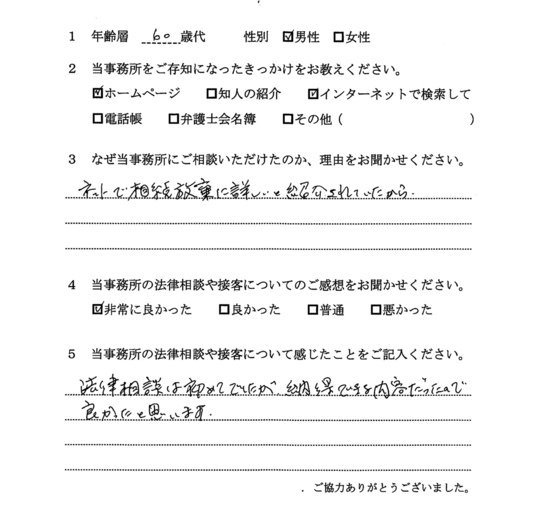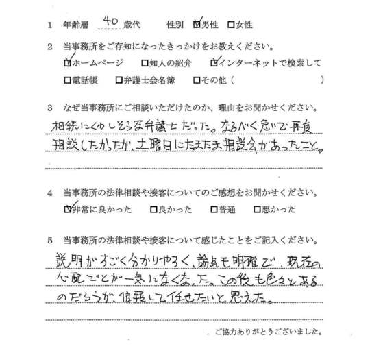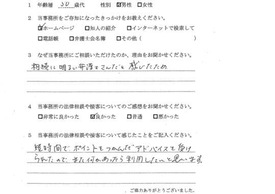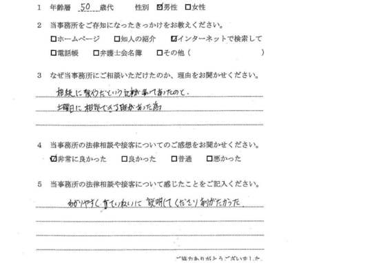 法律相談は初めてでしたが、納得できる内容だったので良かったと思います。