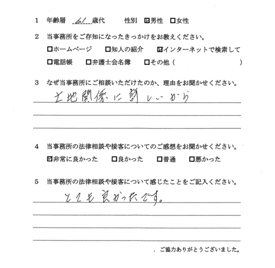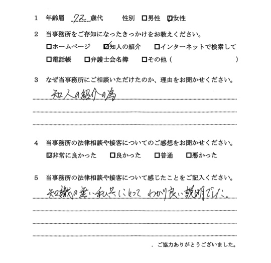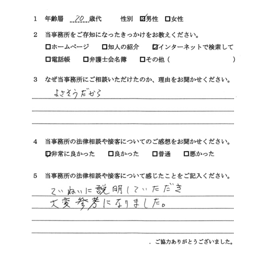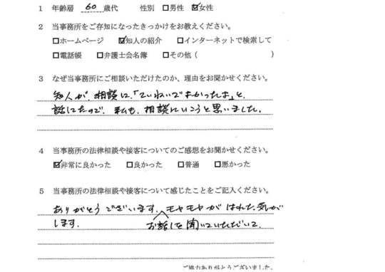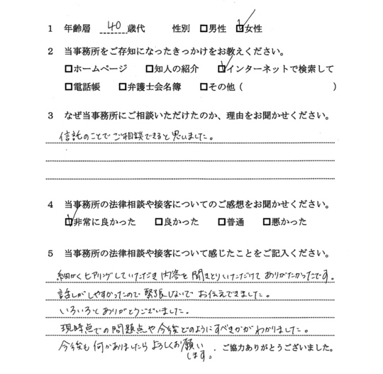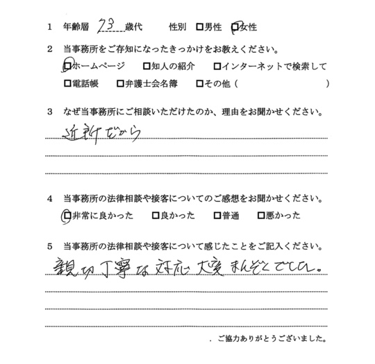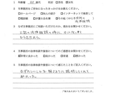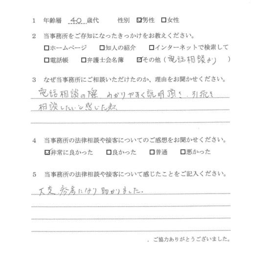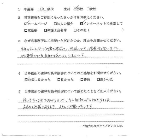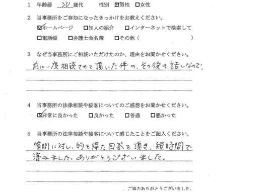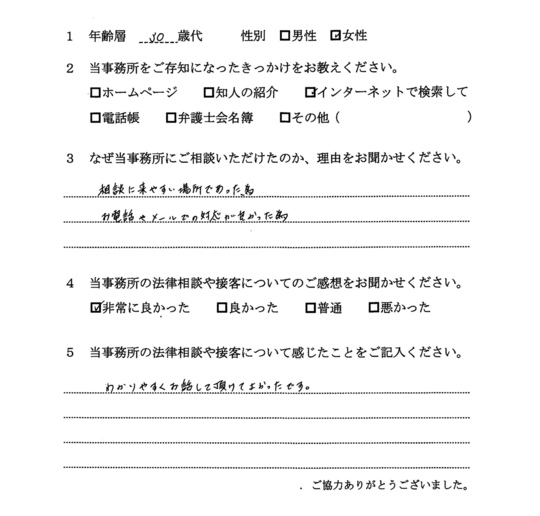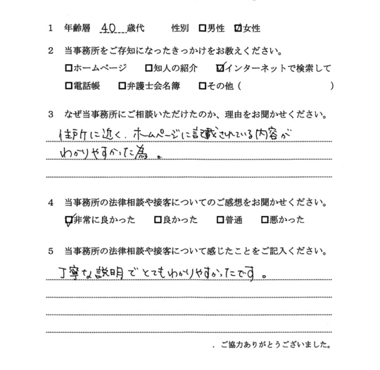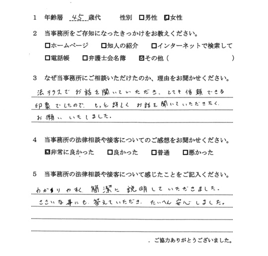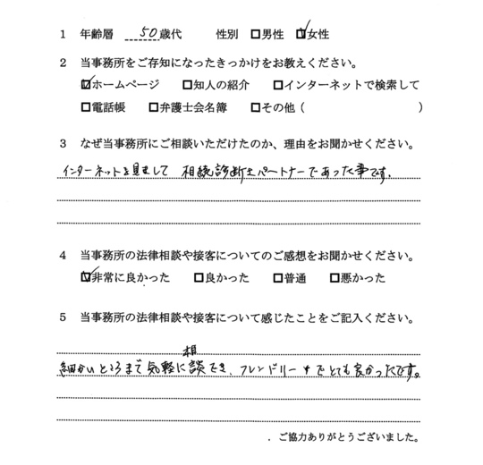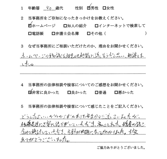 法律相談は初めてでしたが、納得できる内容だったので良かったと思います。