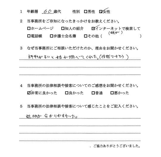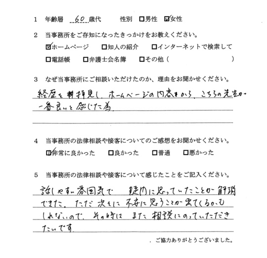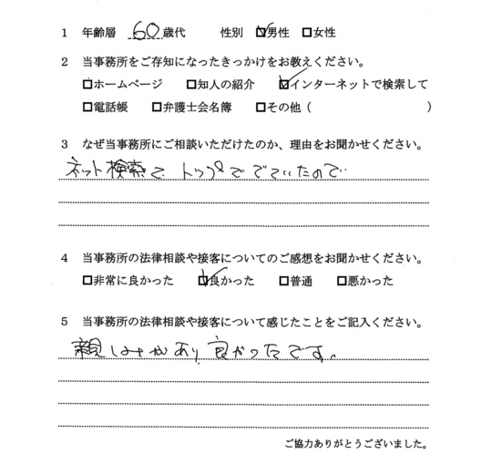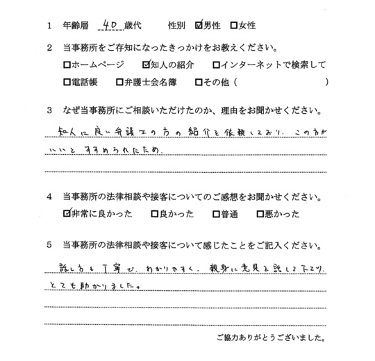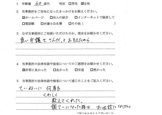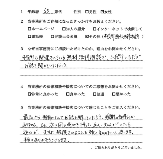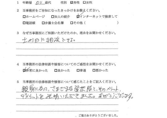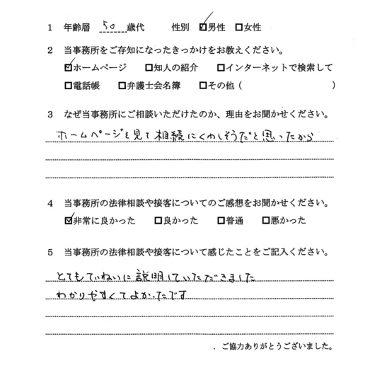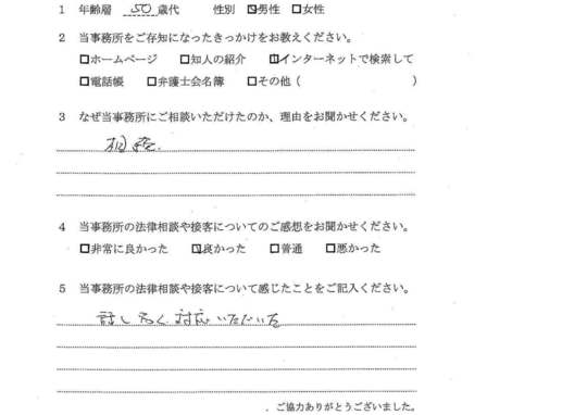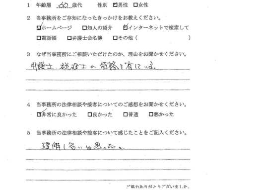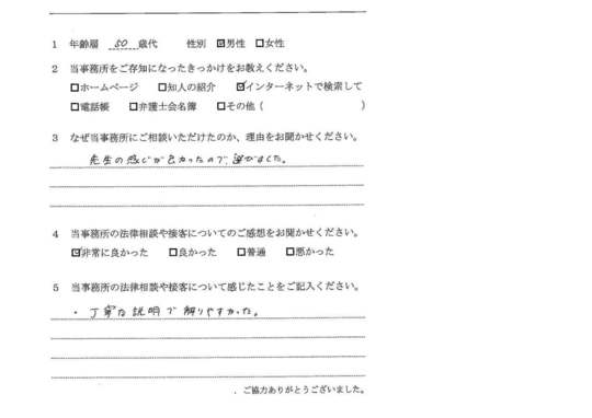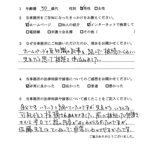 自分でもいろいろと調べていたのですが、先生からいろんな可能性を指摘され助かりました。前に相談した弁護士さんは早口で、話の内容がよくわからなかったのですが、佐藤先生はていねいで、非常にわかりやすかったです。