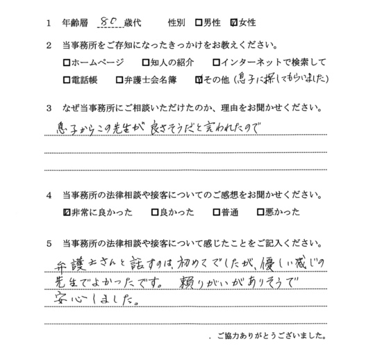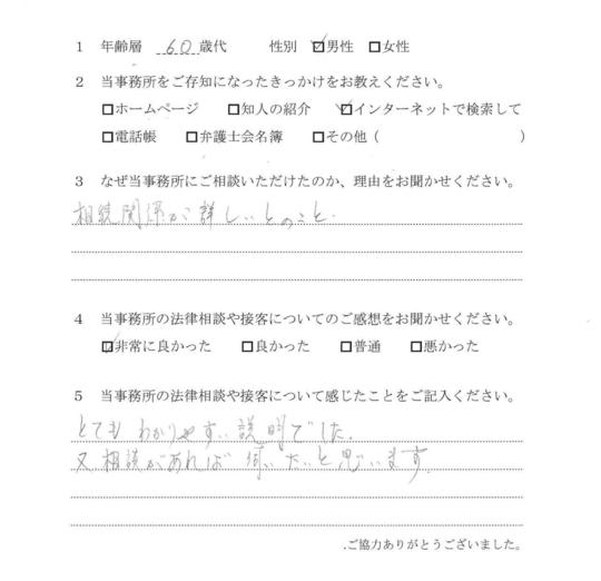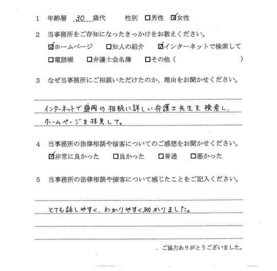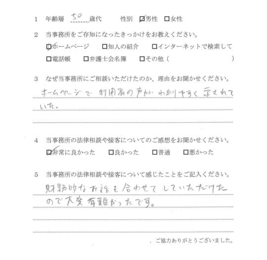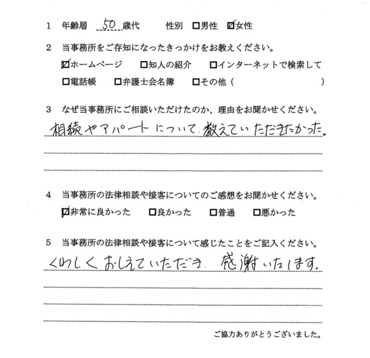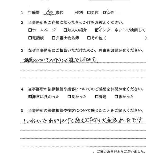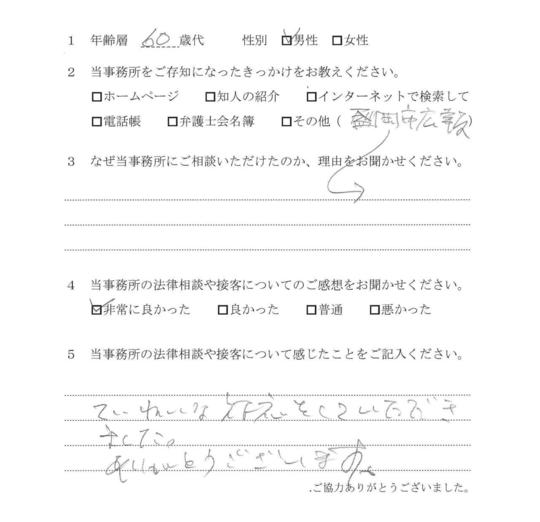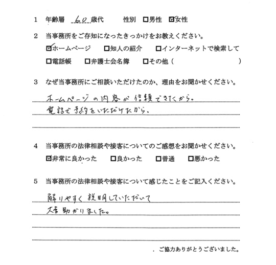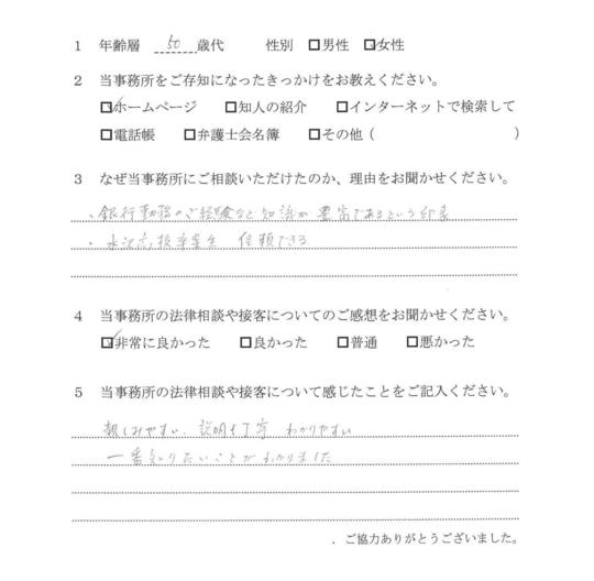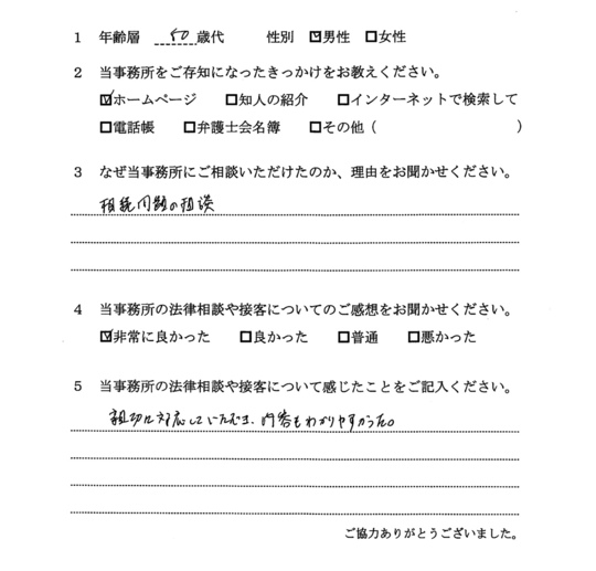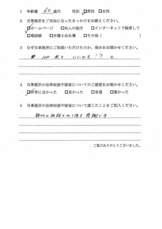 自分でもいろいろと調べていたのですが、先生からいろんな可能性を指摘され助かりました。前に相談した弁護士さんは早口で、話の内容がよくわからなかったのですが、佐藤先生はていねいで、非常にわかりやすかったです。