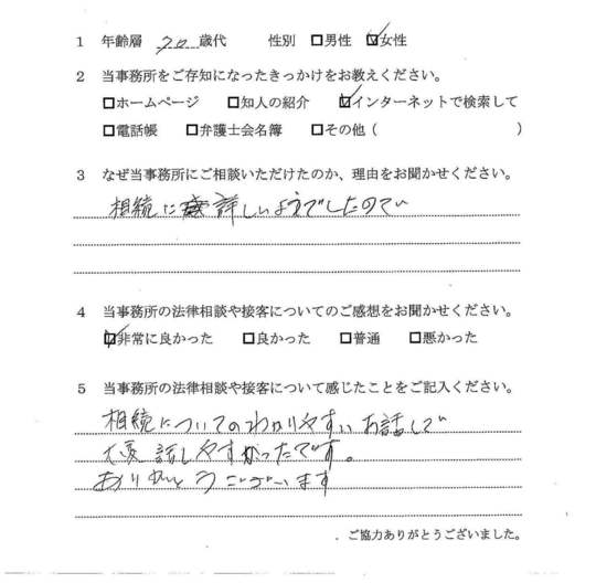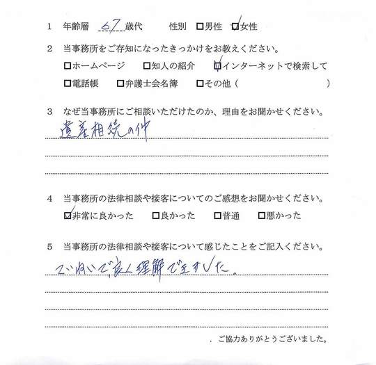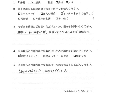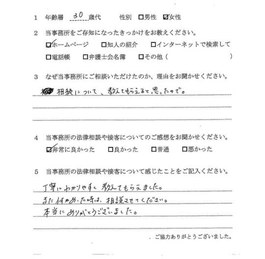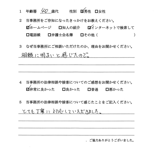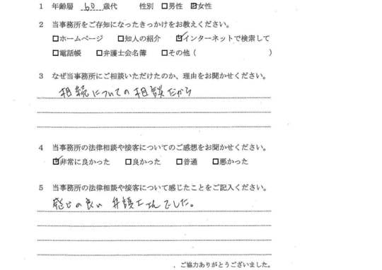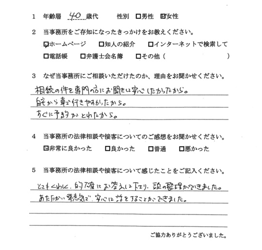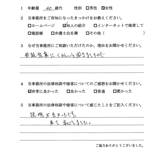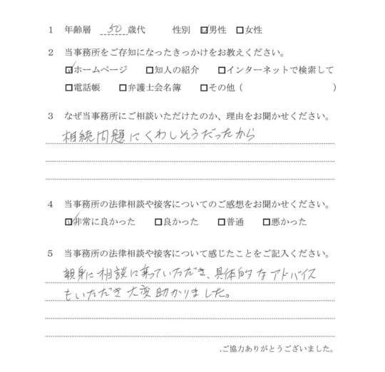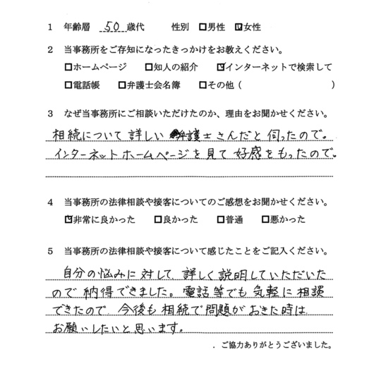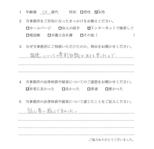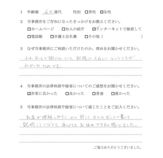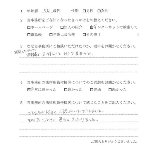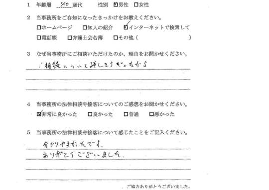 自分の悩みに対して詳しく説明していただいたので、納得できました。電話等でも気軽に相談できたので、今後も相続で問題がおきた時はお願いしたいと思います。