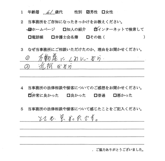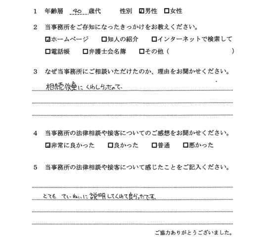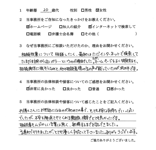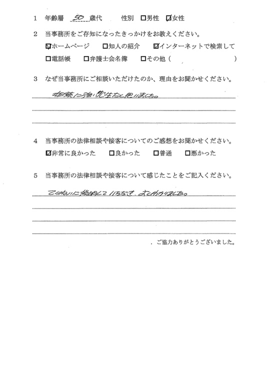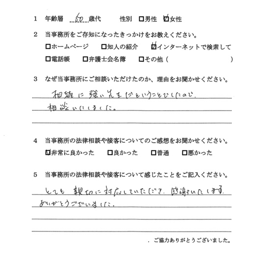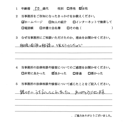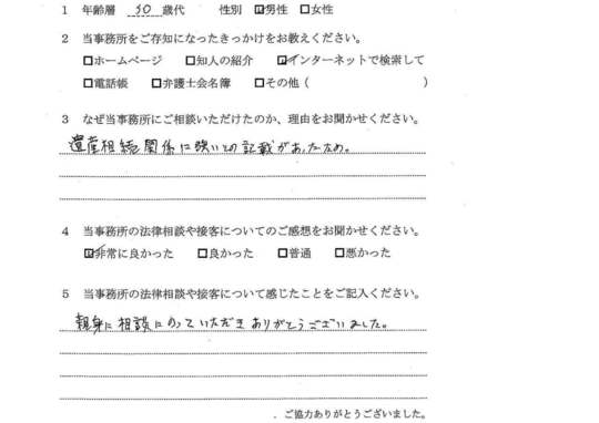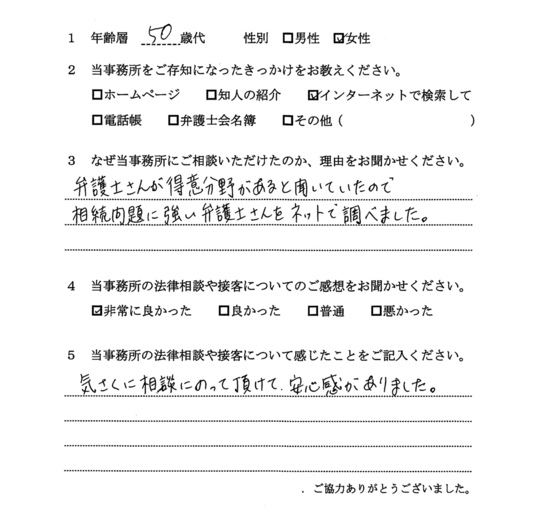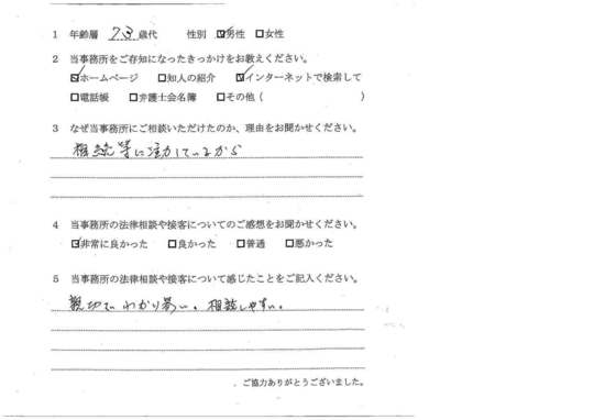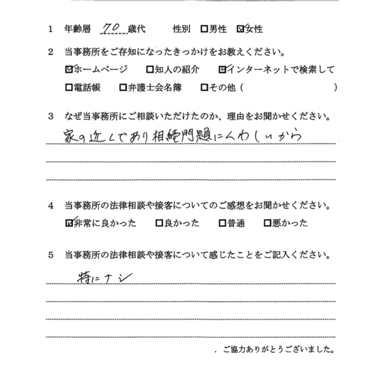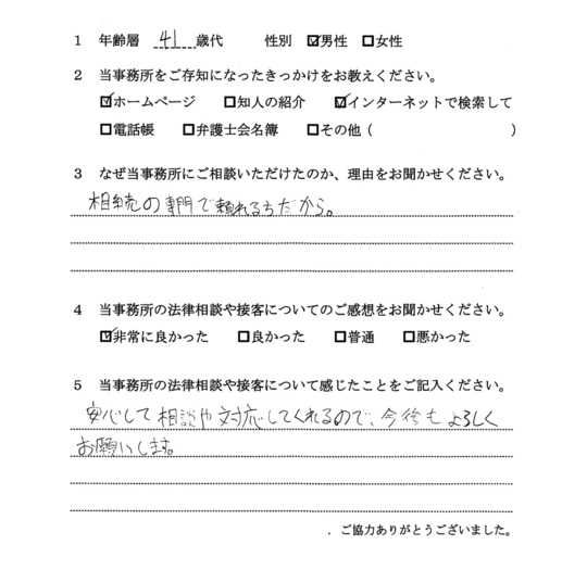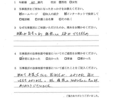 相続放棄について相談したく、最初はただインターネットで検索してたまたま自宅から近いから・・・というのが理由でした。ただ、ホームページをよく拝見すると、相続関係に強そうなのと、他の相談者様の生の声が載っていたのが決め手です。