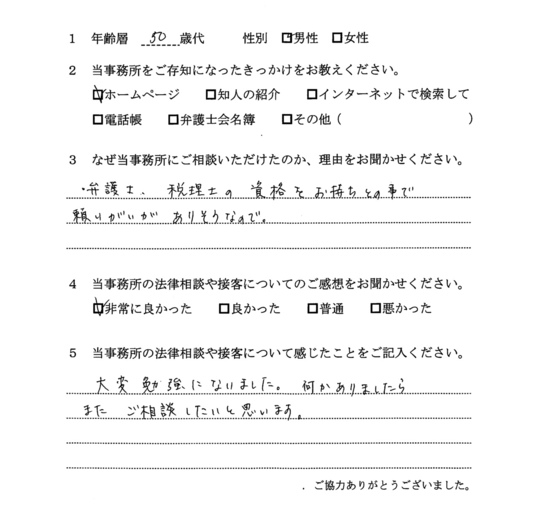 どうしたらいいか分からずかなり不安な日々を送っていましたが、佐藤先生に丁寧に話を聞いていただき、安心しました。税金の話も含めて検討していただき、方針が明確になって助かりました。大変ありがとうございました。