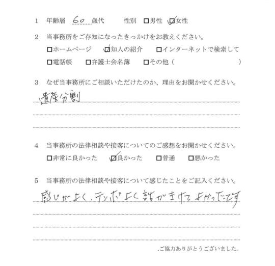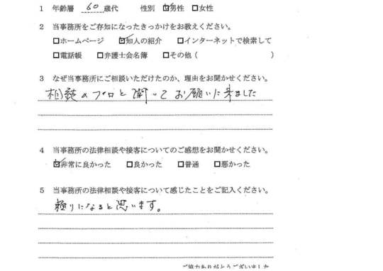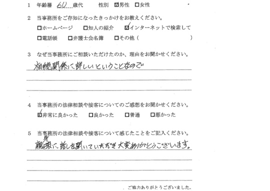 相続に強い先生だということでしたので、相談いたしました。