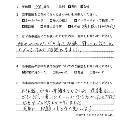 とても話しやすい弁護士さんでした。遺言書をどういう風に書いたらいいか分からなかったのですが、色々アドバイスをしてもらいました。先生にお願いしようと思います。