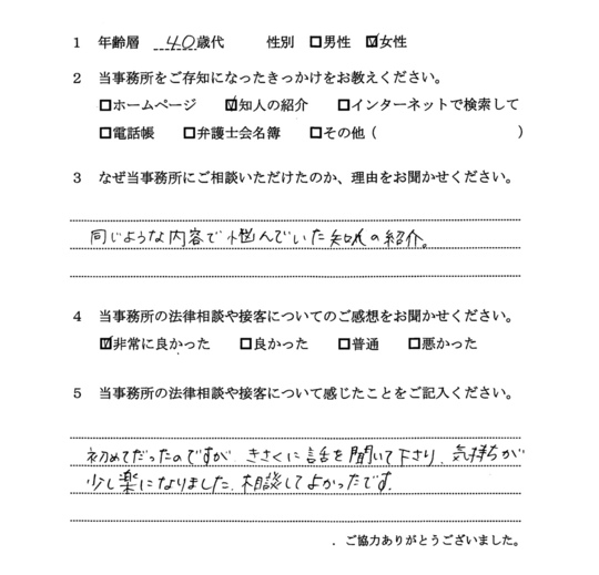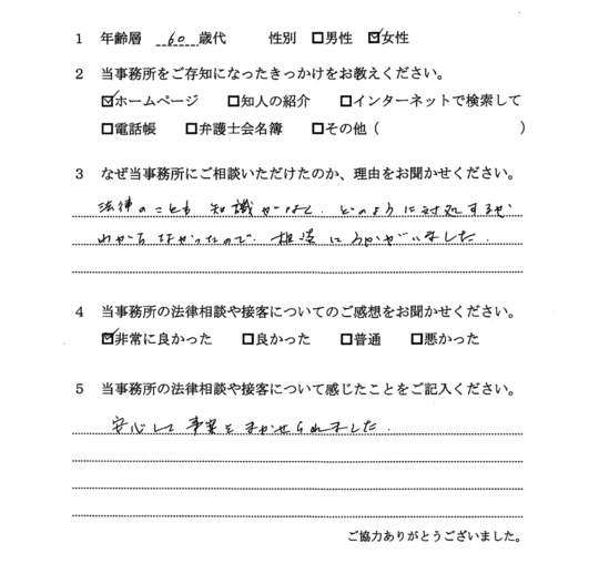 法律のことも知識がなく、どのように対処するかわからなかったので、相談にうかがいました。